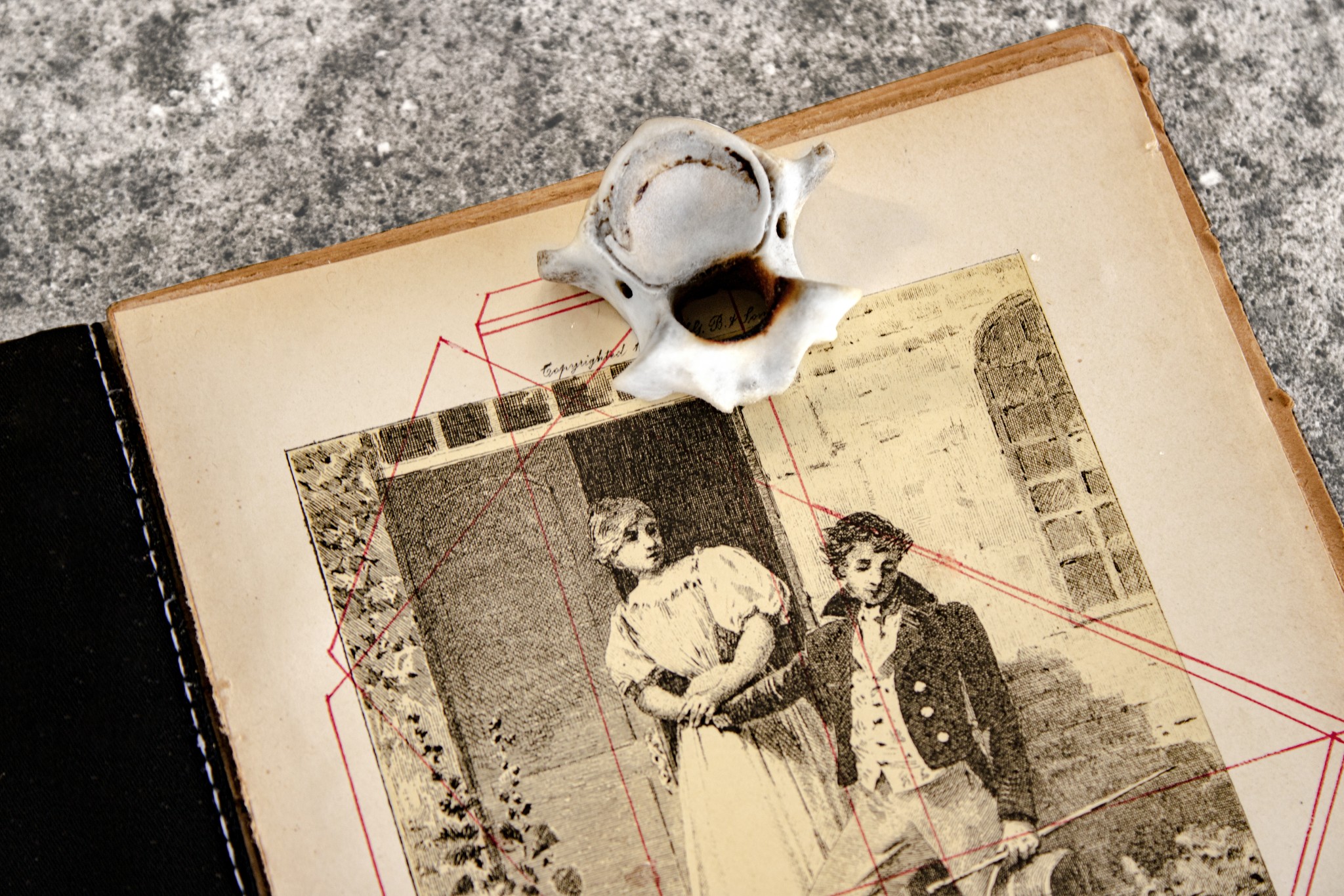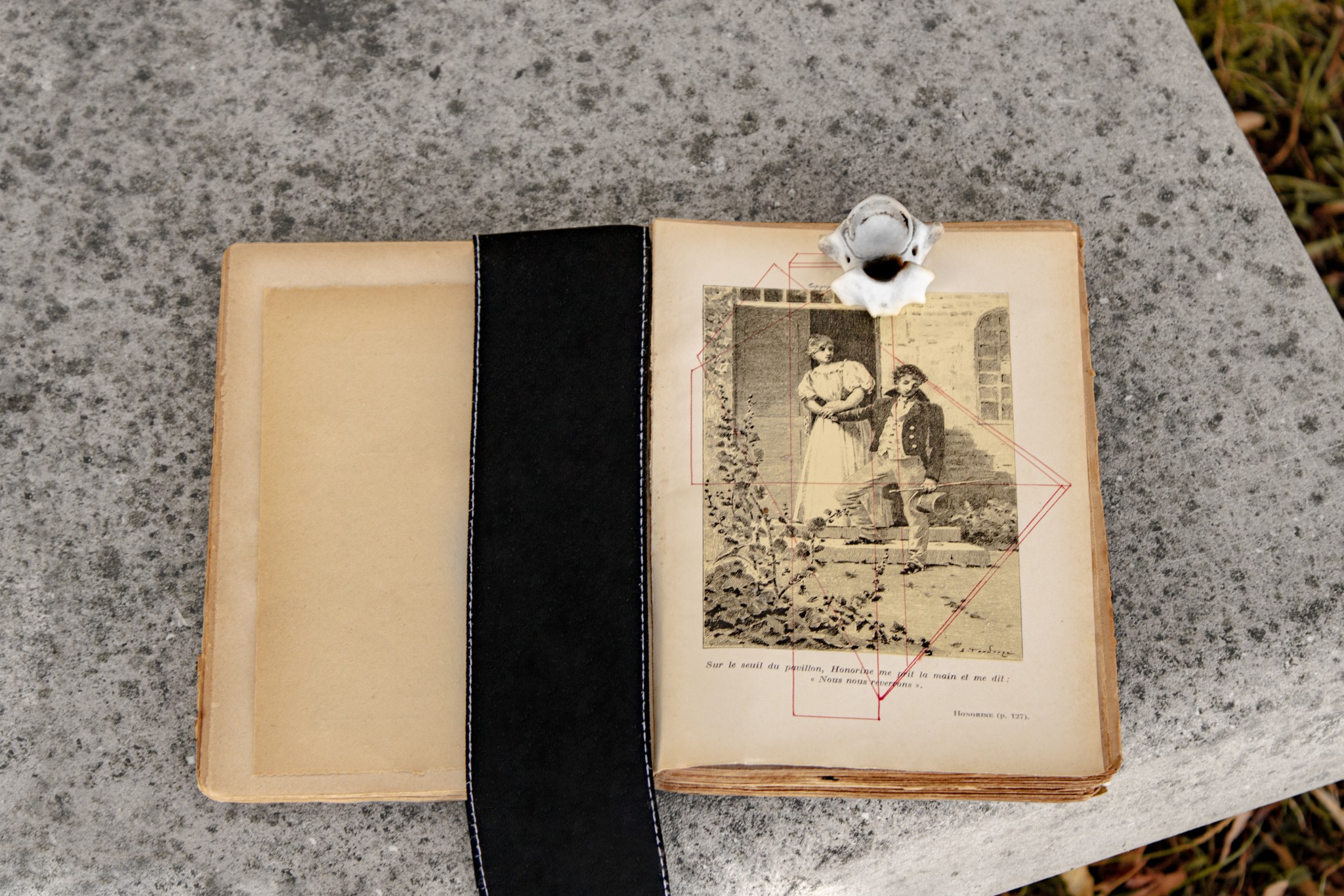 ![]() Pavel Polshchikov, ‘Parfume Overdose’, Honore de Balzac’s book “Honorine”’ (1970s edition), cotton, paper, markers, mutton bone, 2025 |