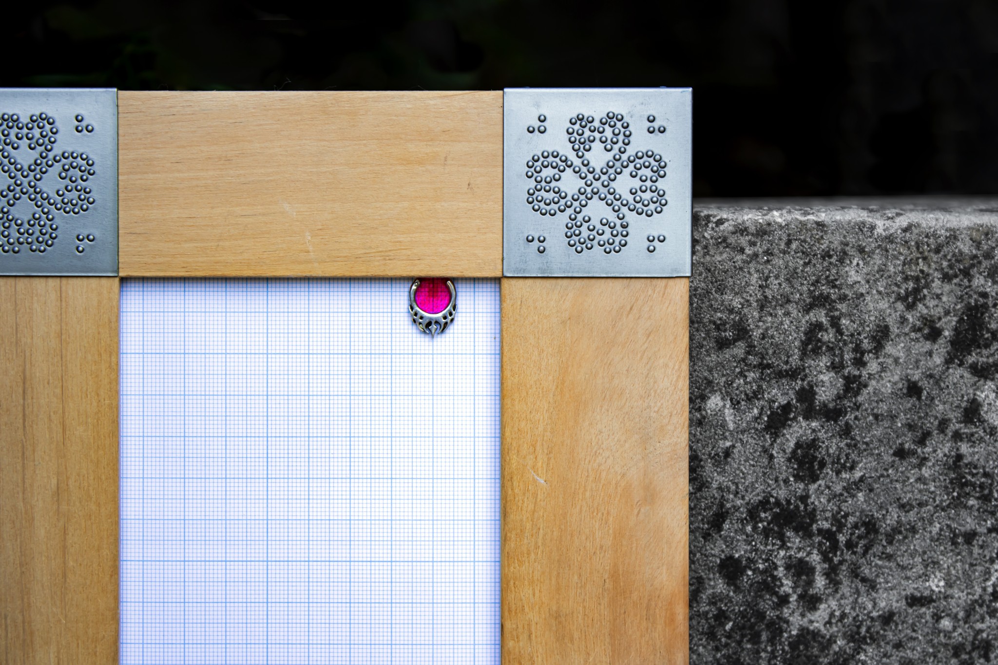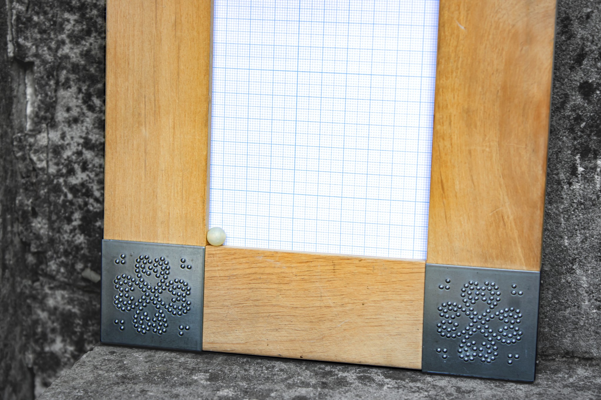 ![]() Pavel Polshchikov, ‘When you test my polygon, I become liquid’, graph paper, silver, markers, agate, vintage ikea frame, 2025 |